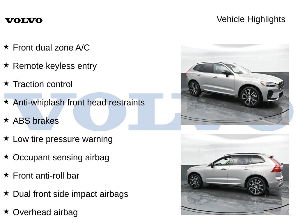 2025 Volvo XC60 4-Wheel Disc Brakes, ABS brakes, Active Cruise Control, Alloy wheels, Anti-whiplash front head restraints, Dual front impact airbags, Dual front side impact airbags, Electronic Stability Control, Front anti-roll bar, Front dual zone A/C, Heated door mirrors, Heated Front Bucket Seats, Heated front seats, Illuminated entry, Low tire pressure warning, Occupant sensing airbag, Overhead airbag, Power Liftgate, Power moonroof, Rear anti-roll bar, Remote keyless entry, Traction control. Silver Dawn Metallic AWD Automatic with Geartronic 2.0L I4 Turbocharged DOHC 16V LEV3-ULEV70