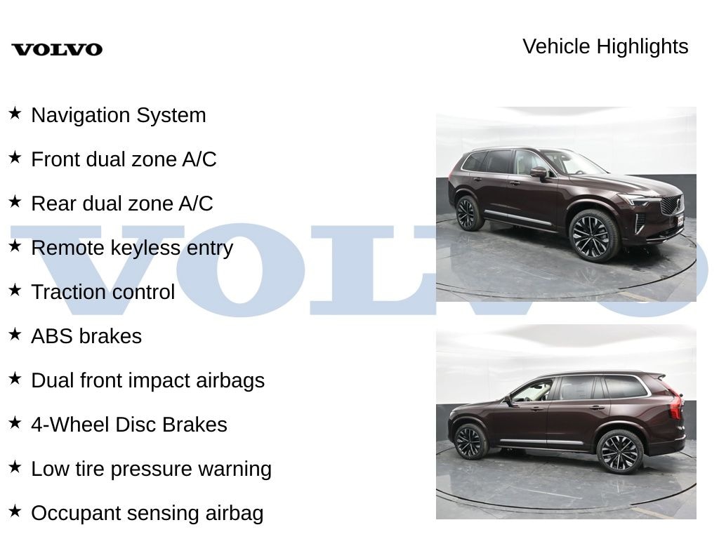 2025 Volvo XC90 6 Passenger 2025.5 4-Wheel Disc Brakes, ABS brakes, Active Cruise Control, Alloy wheels, Anti-whiplash front head restraints, Dual front impact airbags, Dual front side impact airbags, Electronic Stability Control, Front anti-roll bar, Front dual zone A/C, Heated door mirrors, Heated Front Bucket Seats, Heated front seats, Heated rear seats, Illuminated entry, Low tire pressure warning, Navigation System, Occupant sensing airbag, Overhead airbag, Power Liftgate, Power moonroof, Rear anti-roll bar, Rear dual zone A/C, Remote keyless entry, Traction control. Mulberry Red Metallic AWD Automatic with Geartronic 2.0L I4 Hybrid Turbocharged DOHC 16V LEV3-SULEV30