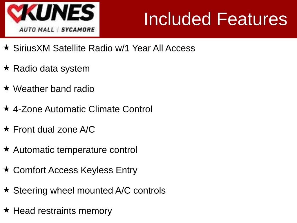 KUNES AUTO MALL OF SYCAMORE - Kunes Auto Group is dedicated to building peopleâs lives in the communities we serve. Weâre family-owned and operated. Gregg Kunes started with Kunes Ford Lincoln in Delavan, Wisconsin in 1996, and over the years we have grown to 40 automobile and RV dealerships throughout the Midwest. Our mission is to not only deliver exceptional customer service, but to serve our communities well in the form of projects, promotions, support, donations, and whatever else is needed. Find out why our dealerships have won DealerRater.com DEALER OF THE YEAR a whopping 10 TIMES! Call, email, or live chat with one of our friendly sales professionals now to schedule your test drive! Price excludes taxes, license and title fees and a $377.63 documentary service fee. While we make every effort to ensure the data listed here is correct, there may be instances where some of the options or vehicle features may be listed incorrectly as we get data from multiple data sources. PLEASE MAKE SURE to confirm the details of this vehicle with the dealer to ensure its accuracy. Dealer cannot be held liable for data that is listed incorrectly. Prices shown do not include taxes, license, and title fees and a $377.63 documentary service fee.
