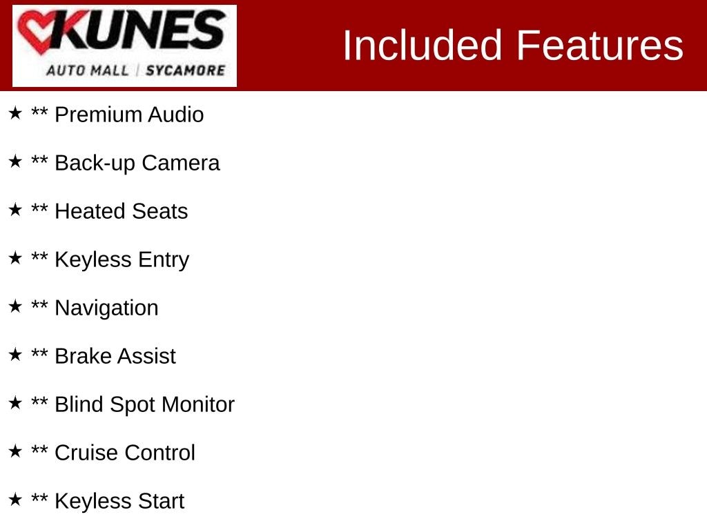 *While we make every effort to ensure the data listed here is correct, there may be instances where some of the factory rebates, incentives, options or vehicle features may be listed incorrectly as we get data from multiple data sources. PLEASE MAKE SURE to confirm the details of this vehicle with the dealer to ensure its accuracy. Dealer cannot be held liable for data that is listed incorrectly. * MSRP is the Manufacturer's Suggested Retail Price (MSRP) of the vehicle. Prices shown do not include taxes, license and title fees and a documentary service fee ($367.70 for Illinois) and tax, title, registration and service fees ($499 for Wisconsin). Consult the dealer for fees, payments and complete details. Consumers, please be aware that the above advertised price assumes you are purchasing the vehicle from the Kunes Auto Group dealership where it is listed as being offered for sale. If the vehicle is transferred from one location to another, a transfer fee for this transportation of $300 will be added to the purchase transaction. If you would like to purchase such vehicle without paying a transfer fee, you can take delivery of the vehicle at the store it is listed as being sold from and avoid the additional transfer fee. Shipping fees vary depending on location, contact dealer for shipping details and costs. Dealer includes all guaranteed factory incentives in the final price of new vehicles. *Policy on Hand Control Driving Devices: To accommodate our customers, we will install portable hand control units that the customer provides to us in order to test drive a vehicle so long as the device can be installed and removed without physical modification or alteration to the vehicle. If the customer does not have a portable vehicle hand control unit, we will provide one. For the safety of our customers and employees, these hand control units are installed at our service department. Appointments for a vehicle test drive using a hand control device are strongly recommended for daytime hours to ensure that a licensed technician is available to install the hand control system and test the safety of the unit before the customer test drives the vehicle. If you have any questions regarding this policy, please contact the General Manager of the dealership.