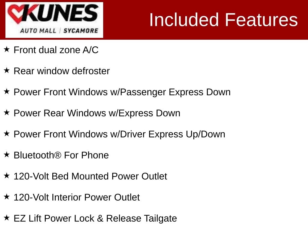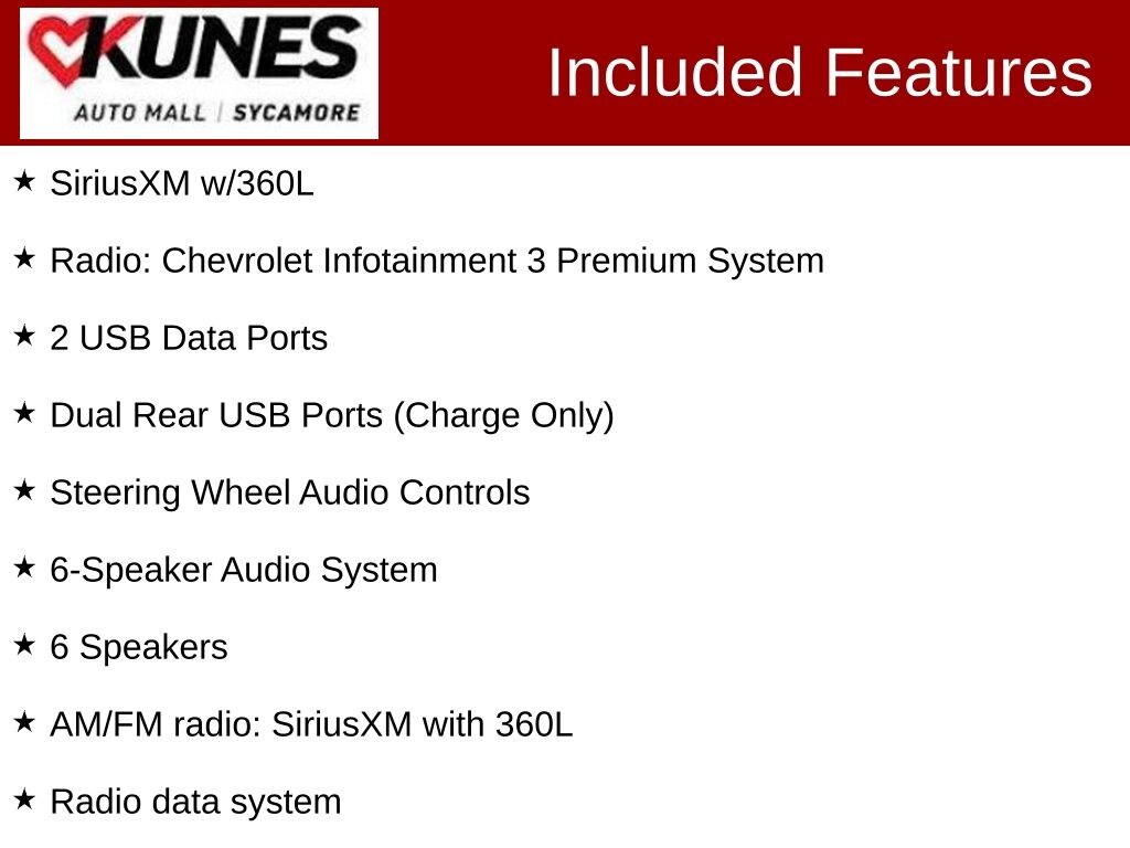 *While we make every effort to ensure the data listed here is correct, there may be instances where some of the factory rebates, incentives, options or vehicle features may be listed incorrectly as we get data from multiple data sources. PLEASE MAKE SURE to confirm the details of this vehicle with the dealer to ensure its accuracy. Dealer cannot be held liable for data that is listed incorrectly. * MSRP is the Manufacturer's Suggested Retail Price (MSRP) of the vehicle. Prices shown do not include taxes, license and title fees. Consumers, please be aware that the above advertised price assumes you are purchasing the vehicle from the Kunes Auto Group dealership where it is listed as being offered for sale. If the vehicle is transferred from one location to another, a transfer fee for this transportation of $300 will be added to the purchase transaction. If you would like to purchase such vehicle without paying a transfer fee, you can take delivery of the vehicle at the store it is listed as being sold from and avoid the additional transfer fee. Shipping fees vary depending on location, contact dealer for shipping details and costs. Dealer includes all guaranteed factory incentives in the final price of new vehicles. *Policy on Hand Control Driving Devices: To accommodate our customers, we will install portable hand control units that the customer provides to us in order to test drive a vehicle so long as the device can be installed and removed without physical modification or alteration to the vehicle. If the customer does not have a portable vehicle hand control unit, we will provide one. For the safety of our customers and employees, these hand control units are installed at our service department. Appointments for a vehicle test drive using a hand control device are strongly recommended for daytime hours to ensure that a licensed technician is available to install the hand control system and test the safety of the unit before the customer test drives the vehicle. If you have any questions regarding this policy, please contact the General Manager of the dealership.