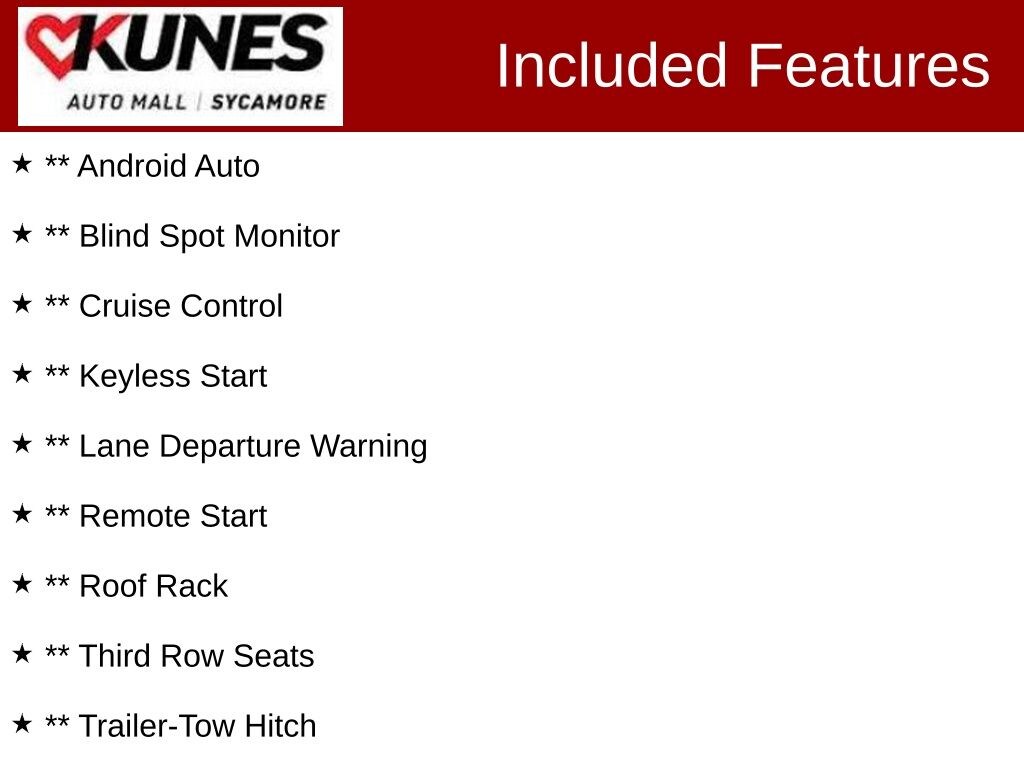 *While we make every effort to ensure the data listed here is correct, there may be instances where some of the factory rebates, incentives, options or vehicle features may be listed incorrectly as we get data from multiple data sources. PLEASE MAKE SURE to confirm the details of this vehicle with the dealer to ensure its accuracy. Dealer cannot be held liable for data that is listed incorrectly. * MSRP is the Manufacturer's Suggested Retail Price (MSRP) of the vehicle. Prices shown do not include taxes, license and title fees and a documentary service fee ($377.63 for Illinois) and tax, title, registration and service fees ($599 for Wisconsin). Consult the dealer for fees, payments and complete details. Consumers, please be aware that the above advertised price assumes you are purchasing the vehicle from the Kunes Auto Group dealership where it is listed as being offered for sale. If the vehicle is transferred from one location to another, a transfer fee for this transportation of $300 will be added to the purchase transaction. If you would like to purchase such vehicle without paying a transfer fee, you can take delivery of the vehicle at the store it is listed as being sold from and avoid the additional transfer fee. Shipping fees vary depending on location, contact dealer for shipping details and costs. Dealer includes all guaranteed factory incentives in the final price of new vehicles. *Policy on Hand Control Driving Devices: To accommodate our customers, we will install portable hand control units that the customer provides to us in order to test drive a vehicle so long as the device can be installed and removed without physical modification or alteration to the vehicle. If the customer does not have a portable vehicle hand control unit, we will provide one. For the safety of our customers and employees, these hand control units are installed at our service department. Appointments for a vehicle test drive using a hand control device are strongly recommended for daytime hours to ensure that a licensed technician is available to install the hand control system and test the safety of the unit before the customer test drives the vehicle. If you have any questions regarding this policy, please contact the General Manager of the dealership.