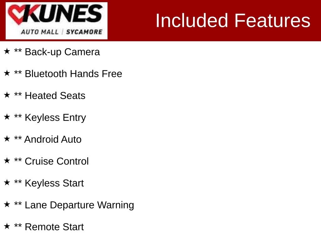 *While we make every effort to ensure the data listed here is correct, there may be instances where some of the factory rebates, incentives, options or vehicle features may be listed incorrectly as we get data from multiple data sources. PLEASE MAKE SURE to confirm the details of this vehicle with the dealer to ensure its accuracy. Dealer cannot be held liable for data that is listed incorrectly. * MSRP is the Manufacturer's Suggested Retail Price (MSRP) of the vehicle. Prices shown do not include taxes, license and title fees and a documentary service fee ($367.70 for Illinois) and tax, title, registration and service fees ($499 for Wisconsin). Consult the dealer for fees, payments and complete details. Consumers, please be aware that the above advertised price assumes you are purchasing the vehicle from the Kunes Auto Group dealership where it is listed as being offered for sale. If the vehicle is transferred from one location to another, a transfer fee for this transportation of $300 will be added to the purchase transaction. If you would like to purchase such vehicle without paying a transfer fee, you can take delivery of the vehicle at the store it is listed as being sold from and avoid the additional transfer fee. Shipping fees vary depending on location, contact dealer for shipping details and costs. Dealer includes all guaranteed factory incentives in the final price of new vehicles. *Policy on Hand Control Driving Devices: To accommodate our customers, we will install portable hand control units that the customer provides to us in order to test drive a vehicle so long as the device can be installed and removed without physical modification or alteration to the vehicle. If the customer does not have a portable vehicle hand control unit, we will provide one. For the safety of our customers and employees, these hand control units are installed at our service department. Appointments for a vehicle test drive using a hand control device are strongly recommended for daytime hours to ensure that a licensed technician is available to install the hand control system and test the safety of the unit before the customer test drives the vehicle. If you have any questions regarding this policy, please contact the General Manager of the dealership.