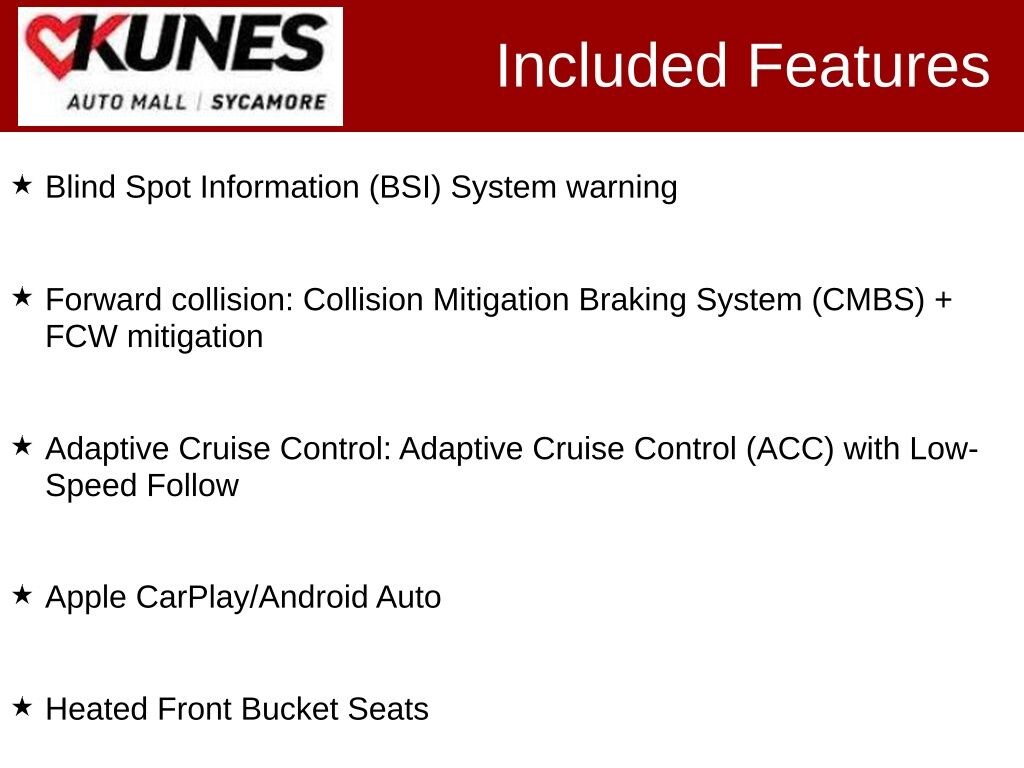 - Adaptive Cruise Control: Adaptive Cruise Control (ACC) with Low-Speed Follow