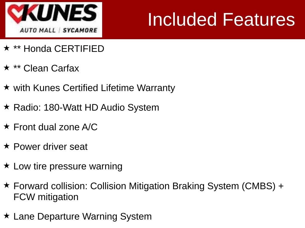 2022 Honda Accord Hybrid Sport ** Honda CERTIFIED, ** Clean Carfax, with Kunes Certified Lifetime Warranty, Adaptive Cruise Control: Adaptive Cruise Control (ACC) with Low-Speed Follow, Apple CarPlay/Android Auto, Exterior Parking Camera Rear, Forward collision: Collision Mitigation Braking System (CMBS) + FCW mitigation, Front dual zone A/C, Heated front seats, Lane Departure Warning System, Low tire pressure warning, Power driver seat, Radio: 180-Watt HD Audio System. Clean CARFAX.