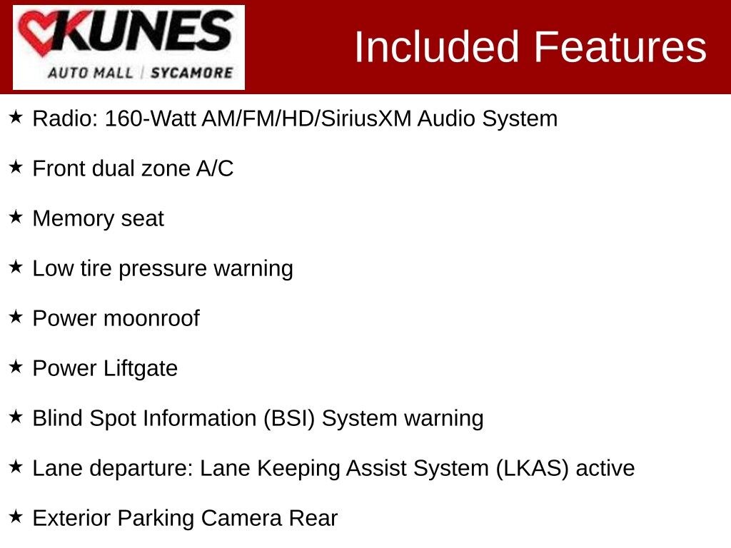 KUNES AUTO MALL OF SYCAMORE - Kunes Auto Group is dedicated to building peopleâs lives in the communities we serve. Weâre family-owned and operated. Gregg Kunes started with Kunes Ford Lincoln in Delavan, Wisconsin in 1996, and over the years we have grown to 40 automobile and RV dealerships throughout the Midwest. Our mission is to not only deliver exceptional customer service, but to serve our communities well in the form of projects, promotions, support, donations, and whatever else is needed. Find out why our dealerships have won DealerRater.com DEALER OF THE YEAR a whopping 10 TIMES! Call, email, or live chat with one of our friendly sales professionals now to schedule your test drive! Price excludes taxes, license and title fees and a $377.63 documentary service fee. While we make every effort to ensure the data listed here is correct, there may be instances where some of the options or vehicle features may be listed incorrectly as we get data from multiple data sources. PLEASE MAKE SURE to confirm the details of this vehicle with the dealer to ensure its accuracy. Dealer cannot be held liable for data that is listed incorrectly. Prices shown do not include taxes, license, and title fees and a $377.63 documentary service fee.