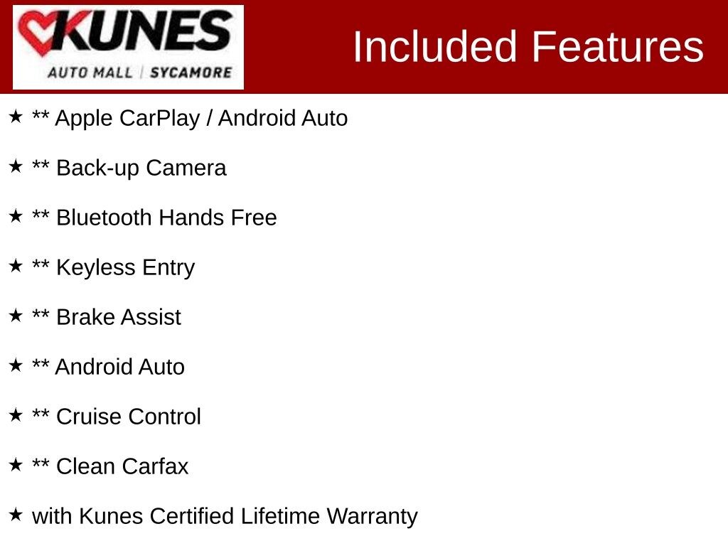 *While we make every effort to ensure the data listed here is correct, there may be instances where some of the factory rebates, incentives, options or vehicle features may be listed incorrectly as we get data from multiple data sources. PLEASE MAKE SURE to confirm the details of this vehicle with the dealer to ensure its accuracy. Dealer cannot be held liable for data that is listed incorrectly. * MSRP is the Manufacturer's Suggested Retail Price (MSRP) of the vehicle. Prices shown do not include taxes, license and title fees and a documentary service fee ($367.70 for Illinois) and tax, title, registration and service fees ($499 for Wisconsin). Consult the dealer for fees, payments and complete details. Consumers, please be aware that the above advertised price assumes you are purchasing the vehicle from the Kunes Auto Group dealership where it is listed as being offered for sale. If the vehicle is transferred from one location to another, a transfer fee for this transportation of $300 will be added to the purchase transaction. If you would like to purchase such vehicle without paying a transfer fee, you can take delivery of the vehicle at the store it is listed as being sold from and avoid the additional transfer fee. Shipping fees vary depending on location, contact dealer for shipping details and costs. Dealer includes all guaranteed factory incentives in the final price of new vehicles. *Policy on Hand Control Driving Devices: To accommodate our customers, we will install portable hand control units that the customer provides to us in order to test drive a vehicle so long as the device can be installed and removed without physical modification or alteration to the vehicle. If the customer does not have a portable vehicle hand control unit, we will provide one. For the safety of our customers and employees, these hand control units are installed at our service department. Appointments for a vehicle test drive using a hand control device are strongly recommended for daytime hours to ensure that a licensed technician is available to install the hand control system and test the safety of the unit before the customer test drives the vehicle. If you have any questions regarding this policy, please contact the General Manager of the dealership.