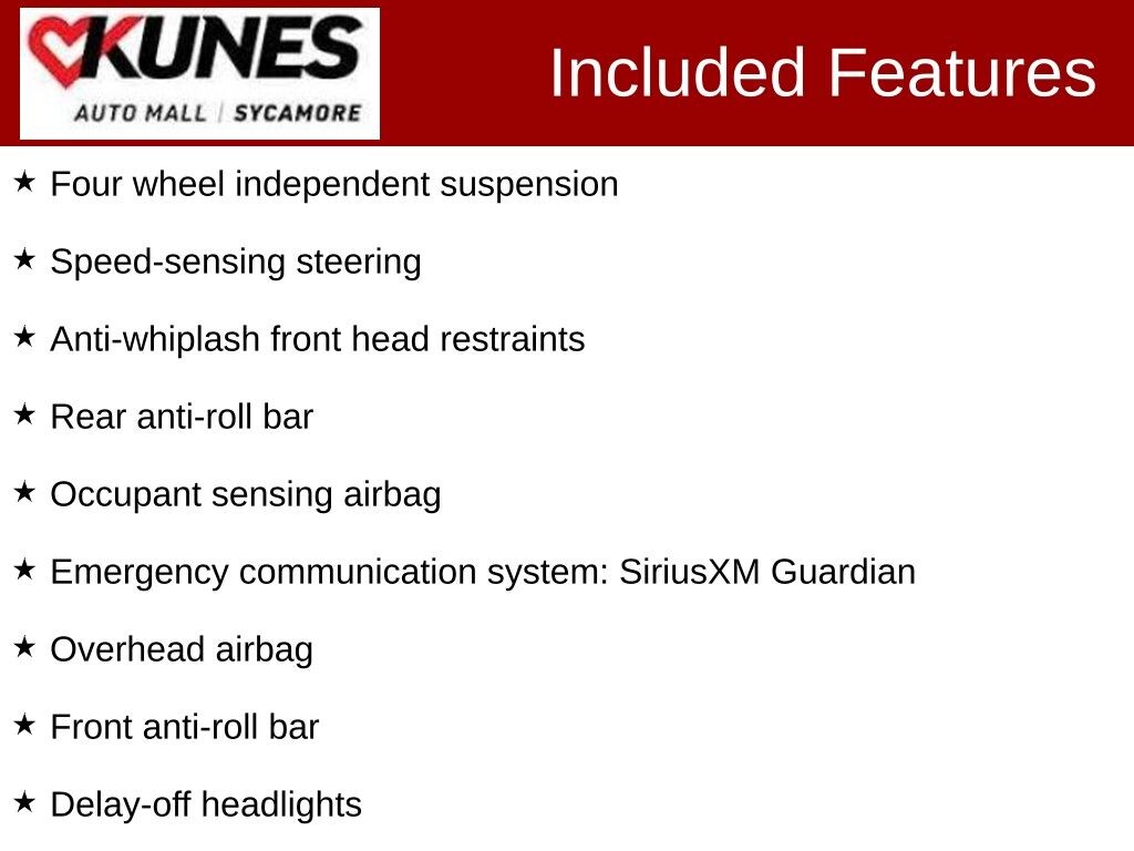 *While we make every effort to ensure the data listed here is correct, there may be instances where some of the factory rebates, incentives, options or vehicle features may be listed incorrectly as we get data from multiple data sources. PLEASE MAKE SURE to confirm the details of this vehicle with the dealer to ensure its accuracy. Dealer cannot be held liable for data that is listed incorrectly. * MSRP is the Manufacturer's Suggested Retail Price (MSRP) of the vehicle. Prices shown do not include taxes, license and title fees and a documentary service fee ($377.63 for Illinois) and tax, title, registration and service fees ($599 for Wisconsin). Consult the dealer for fees, payments and complete details. Consumers, please be aware that the above advertised price assumes you are purchasing the vehicle from the Kunes Auto Group dealership where it is listed as being offered for sale. If the vehicle is transferred from one location to another, a transfer fee for this transportation of $300 will be added to the purchase transaction. If you would like to purchase such vehicle without paying a transfer fee, you can take delivery of the vehicle at the store it is listed as being sold from and avoid the additional transfer fee. Shipping fees vary depending on location, contact dealer for shipping details and costs. Dealer includes all guaranteed factory incentives in the final price of new vehicles. *Policy on Hand Control Driving Devices: To accommodate our customers, we will install portable hand control units that the customer provides to us in order to test drive a vehicle so long as the device can be installed and removed without physical modification or alteration to the vehicle. If the customer does not have a portable vehicle hand control unit, we will provide one. For the safety of our customers and employees, these hand control units are installed at our service department. Appointments for a vehicle test drive using a hand control device are strongly recommended for daytime hours to ensure that a licensed technician is available to install the hand control system and test the safety of the unit before the customer test drives the vehicle. If you have any questions regarding this policy, please contact the General Manager of the dealership.