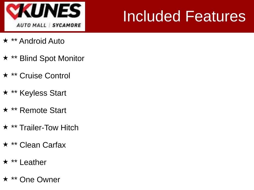 *While we make every effort to ensure the data listed here is correct, there may be instances where some of the factory rebates, incentives, options or vehicle features may be listed incorrectly as we get data from multiple data sources. PLEASE MAKE SURE to confirm the details of this vehicle with the dealer to ensure its accuracy. Dealer cannot be held liable for data that is listed incorrectly. * MSRP is the Manufacturer's Suggested Retail Price (MSRP) of the vehicle. Prices shown do not include taxes, license and title fees and a documentary service fee ($367.70 for Illinois) and tax, title, registration and service fees ($499 for Wisconsin). Consult the dealer for fees, payments and complete details. Consumers, please be aware that the above advertised price assumes you are purchasing the vehicle from the Kunes Auto Group dealership where it is listed as being offered for sale. If the vehicle is transferred from one location to another, a transfer fee for this transportation of $300 will be added to the purchase transaction. If you would like to purchase such vehicle without paying a transfer fee, you can take delivery of the vehicle at the store it is listed as being sold from and avoid the additional transfer fee. Shipping fees vary depending on location, contact dealer for shipping details and costs. Dealer includes all guaranteed factory incentives in the final price of new vehicles. *Policy on Hand Control Driving Devices: To accommodate our customers, we will install portable hand control units that the customer provides to us in order to test drive a vehicle so long as the device can be installed and removed without physical modification or alteration to the vehicle. If the customer does not have a portable vehicle hand control unit, we will provide one. For the safety of our customers and employees, these hand control units are installed at our service department. Appointments for a vehicle test drive using a hand control device are strongly recommended for daytime hours to ensure that a licensed technician is available to install the hand control system and test the safety of the unit before the customer test drives the vehicle. If you have any questions regarding this policy, please contact the General Manager of the dealership.
