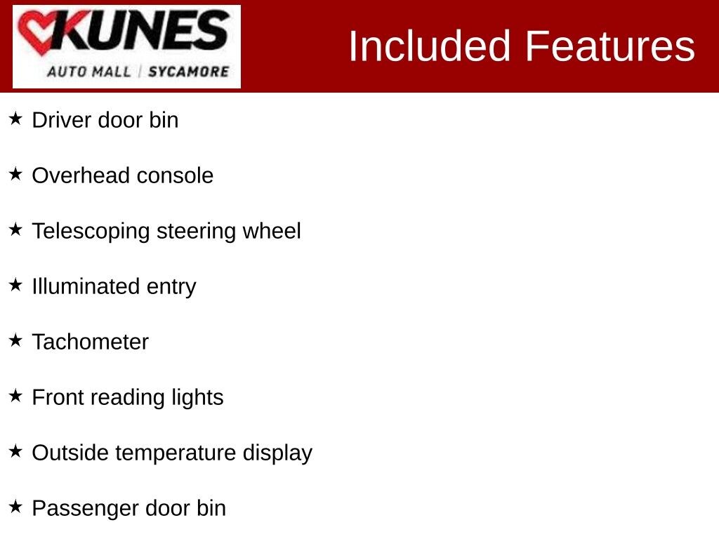 *While we make every effort to ensure the data listed here is correct, there may be instances where some of the factory rebates, incentives, options or vehicle features may be listed incorrectly as we get data from multiple data sources. PLEASE MAKE SURE to confirm the details of this vehicle with the dealer to ensure its accuracy. Dealer cannot be held liable for data that is listed incorrectly. * MSRP is the Manufacturer's Suggested Retail Price (MSRP) of the vehicle. Prices shown do not include taxes, license and title fees. Consumers, please be aware that the above advertised price assumes you are purchasing the vehicle from the Kunes Auto Group dealership where it is listed as being offered for sale. If the vehicle is transferred from one location to another, a transfer fee for this transportation of $300 will be added to the purchase transaction. If you would like to purchase such vehicle without paying a transfer fee, you can take delivery of the vehicle at the store it is listed as being sold from and avoid the additional transfer fee. Shipping fees vary depending on location, contact dealer for shipping details and costs. Dealer includes all guaranteed factory incentives in the final price of new vehicles. *Policy on Hand Control Driving Devices: To accommodate our customers, we will install portable hand control units that the customer provides to us in order to test drive a vehicle so long as the device can be installed and removed without physical modification or alteration to the vehicle. If the customer does not have a portable vehicle hand control unit, we will provide one. For the safety of our customers and employees, these hand control units are installed at our service department. Appointments for a vehicle test drive using a hand control device are strongly recommended for daytime hours to ensure that a licensed technician is available to install the hand control system and test the safety of the unit before the customer test drives the vehicle. If you have any questions regarding this policy, please contact the General Manager of the dealership.