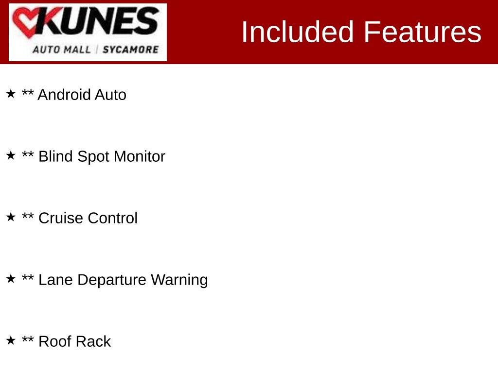 *While we make every effort to ensure the data listed here is correct, there may be instances where some of the factory rebates, incentives, options or vehicle features may be listed incorrectly as we get data from multiple data sources. PLEASE MAKE SURE to confirm the details of this vehicle with the dealer to ensure its accuracy. Dealer cannot be held liable for data that is listed incorrectly. * MSRP is the Manufacturer's Suggested Retail Price (MSRP) of the vehicle. Prices shown do not include taxes, license and title fees and a documentary service fee ($367.70 for Illinois) and tax, title, registration and service fees ($499 for Wisconsin). Consult the dealer for fees, payments and complete details. Consumers, please be aware that the above advertised price assumes you are purchasing the vehicle from the Kunes Auto Group dealership where it is listed as being offered for sale. If the vehicle is transferred from one location to another, a transfer fee for this transportation of $300 will be added to the purchase transaction. If you would like to purchase such vehicle without paying a transfer fee, you can take delivery of the vehicle at the store it is listed as being sold from and avoid the additional transfer fee. Shipping fees vary depending on location, contact dealer for shipping details and costs. Dealer includes all guaranteed factory incentives in the final price of new vehicles. *Policy on Hand Control Driving Devices: To accommodate our customers, we will install portable hand control units that the customer provides to us in order to test drive a vehicle so long as the device can be installed and removed without physical modification or alteration to the vehicle. If the customer does not have a portable vehicle hand control unit, we will provide one. For the safety of our customers and employees, these hand control units are installed at our service department. Appointments for a vehicle test drive using a hand control device are strongly recommended for daytime hours to ensure that a licensed technician is available to install the hand control system and test the safety of the unit before the customer test drives the vehicle. If you have any questions regarding this policy, please contact the General Manager of the dealership.