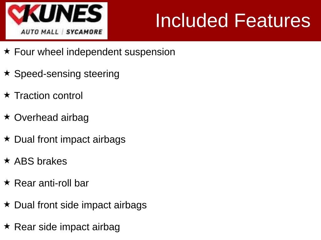 *While we make every effort to ensure the data listed here is correct, there may be instances where some of the factory rebates, incentives, options or vehicle features may be listed incorrectly as we get data from multiple data sources. PLEASE MAKE SURE to confirm the details of this vehicle with the dealer to ensure its accuracy. Dealer cannot be held liable for data that is listed incorrectly. * MSRP is the Manufacturer's Suggested Retail Price (MSRP) of the vehicle. Prices shown do not include taxes, license and title fees and a documentary service fee ($377.63 for Illinois) and tax, title, registration and service fees ($599 for Wisconsin). Consult the dealer for fees, payments and complete details. Consumers, please be aware that the above advertised price assumes you are purchasing the vehicle from the Kunes Auto Group dealership where it is listed as being offered for sale. If the vehicle is transferred from one location to another, a transfer fee for this transportation of $300 will be added to the purchase transaction. If you would like to purchase such vehicle without paying a transfer fee, you can take delivery of the vehicle at the store it is listed as being sold from and avoid the additional transfer fee. Shipping fees vary depending on location, contact dealer for shipping details and costs. Dealer includes all guaranteed factory incentives in the final price of new vehicles. *Policy on Hand Control Driving Devices: To accommodate our customers, we will install portable hand control units that the customer provides to us in order to test drive a vehicle so long as the device can be installed and removed without physical modification or alteration to the vehicle. If the customer does not have a portable vehicle hand control unit, we will provide one. For the safety of our customers and employees, these hand control units are installed at our service department. Appointments for a vehicle test drive using a hand control device are strongly recommended for daytime hours to ensure that a licensed technician is available to install the hand control system and test the safety of the unit before the customer test drives the vehicle. If you have any questions regarding this policy, please contact the General Manager of the dealership.