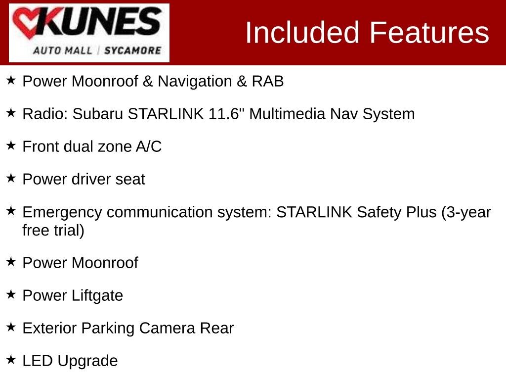 2024 Subaru Outback Wilderness AWD Emergency communication system: STARLINK Safety Plus (3-year free trial), Exterior Parking Camera Rear, Front dual zone A/C, Garage door transmitter: HomeLink, Heated Front Bucket Seats, Heated steering wheel, LED Upgrade, Power driver seat, Power Liftgate, Power Moonroof, Power Moonroof & Navigation & RAB, Radio: Subaru STARLINK 11.6" Multimedia Nav System, Reverse Automatic Braking (RAB) System, StarTex-Trimmed Upholstery.