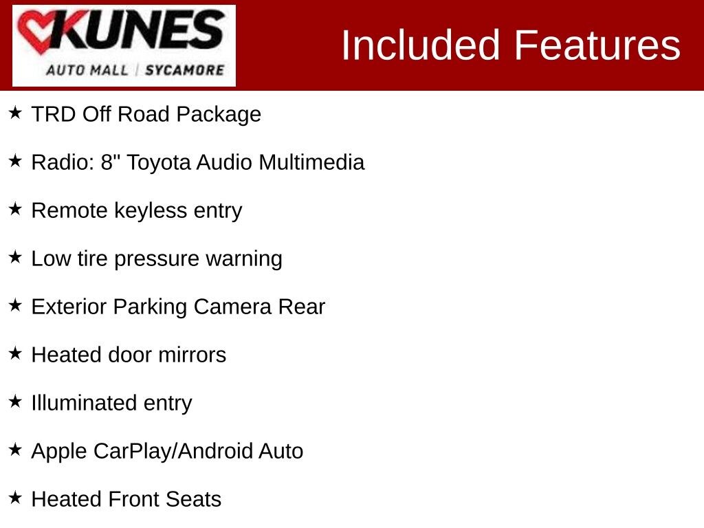 2024 Toyota Tacoma TRD Off-Road Alloy wheels, Apple CarPlay/Android Auto, Exterior Parking Camera Rear, Heated door mirrors, Heated Front Seats, Illuminated entry, Low tire pressure warning, Radio: 8" Toyota Audio Multimedia, Remote keyless entry, TRD Off Road Package.