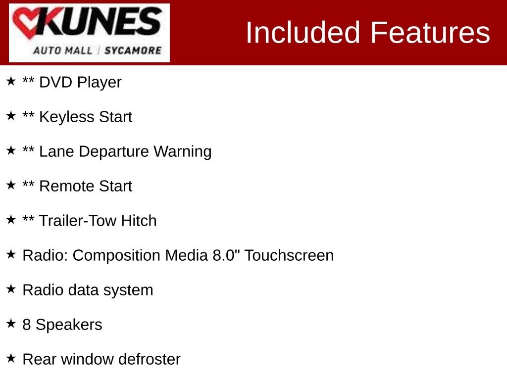 KUNES AUTO MALL OF SYCAMORE - Kunes Auto Group is dedicated to building peopleâs lives in the communities we serve. Weâre family-owned and operated. Gregg Kunes started with Kunes Ford Lincoln in Delavan, Wisconsin in 1996, and over the years we have grown to 40 automobile and RV dealerships throughout the Midwest. Our mission is to not only deliver exceptional customer service, but to serve our communities well in the form of projects, promotions, support, donations, and whatever else is needed. Find out why our dealerships have won DealerRater.com DEALER OF THE YEAR a whopping 10 TIMES! Call, email, or live chat with one of our friendly sales professionals now to schedule your test drive! Price excludes taxes, license and title fees and a $377.63 documentary service fee. While we make every effort to ensure the data listed here is correct, there may be instances where some of the options or vehicle features may be listed incorrectly as we get data from multiple data sources. PLEASE MAKE SURE to confirm the details of this vehicle with the dealer to ensure its accuracy. Dealer cannot be held liable for data that is listed incorrectly. Prices shown do not include taxes, license, and title fees and a $377.63 documentary service fee.